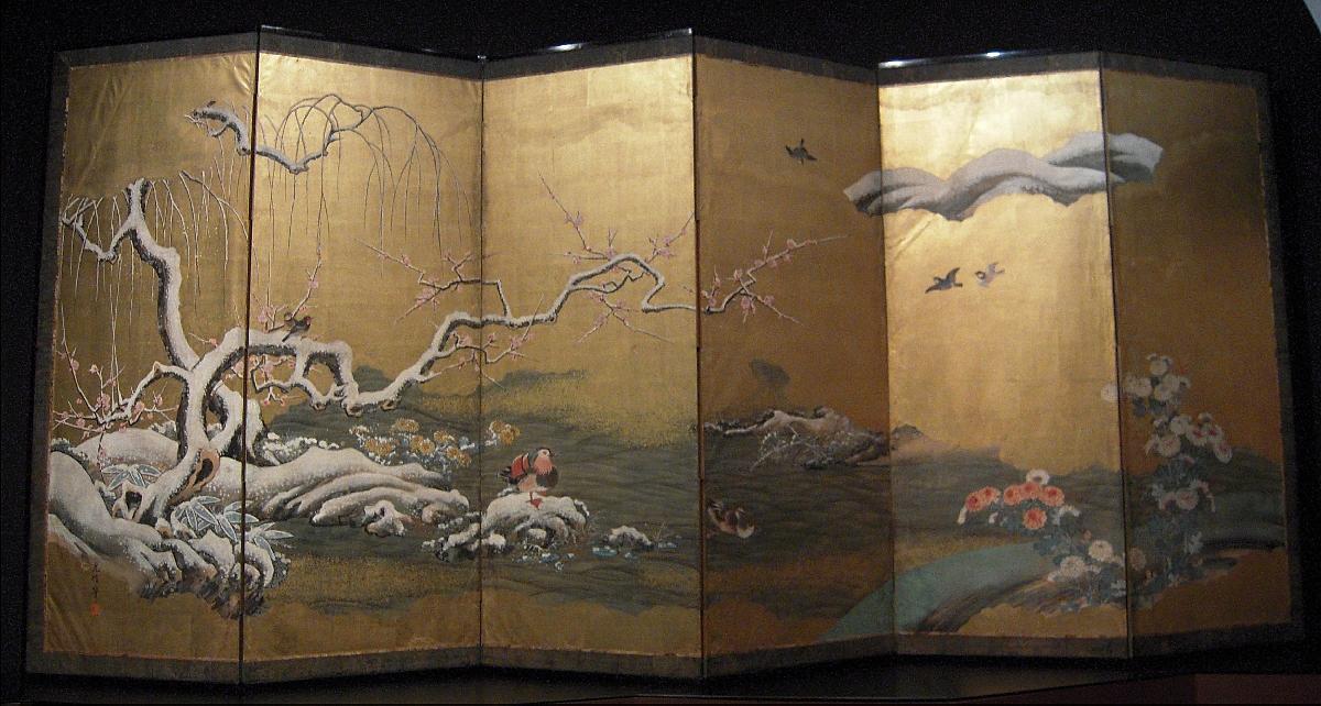 Byōbu (wind wall) are the Japanese folding screens, made from several joined panels bearing decorative painting, used to separate and enclose private spaces. During the Edo Period (1600-1868), Byōbu adorned samurai residences. The backgrounds of byōbu were made from gold leaf and highly colorful paintings depicting nature and scenes from daily life.